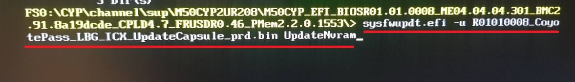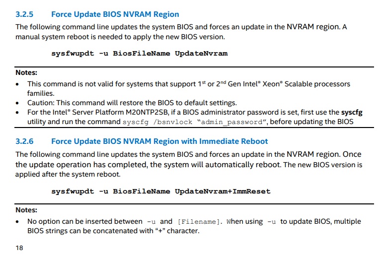Please follow Intel server Firmware Update Utility use guide Page18 to add "UpdateNvram " parameter.