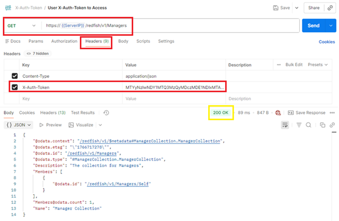 Step 3: Issue GET https://<BMC IP>/redfish/v1/Managers and paste the X-Auth-Token key in the X-Auth-Token field in the Headers tab. Click Send button. Status code should be 200 OK.