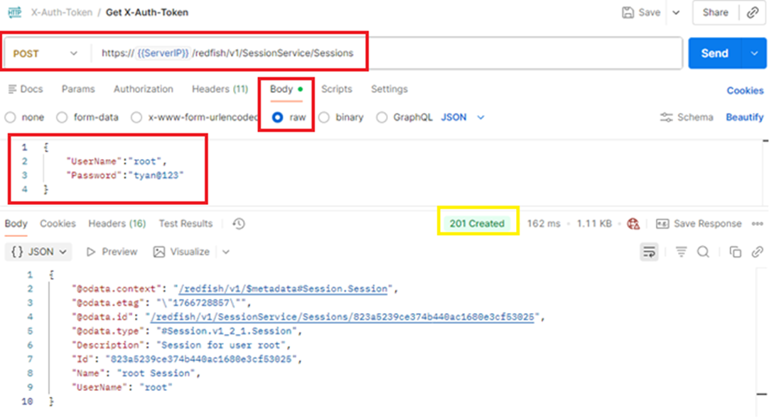 Step 1: Issue POST https://<BMC IP>redfish/v1/SessionService/Sessions with UserName and Password as root/<YourPassword> with raw selected in the Body tab shown in red box below then click Send button. Status code should be 201 Created in yellow box.