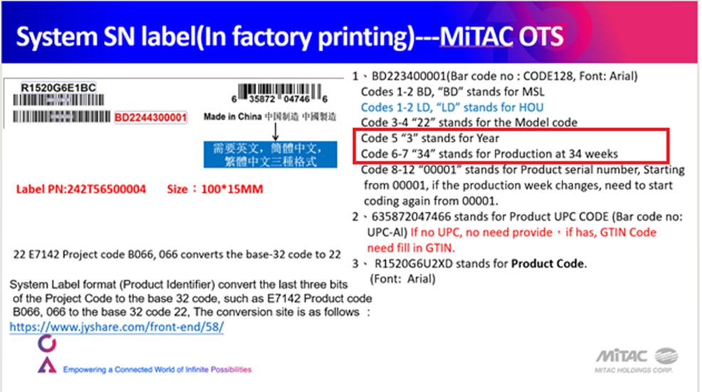 Barebone S/N Format: TC#PPWWP@@@@ Digit 1, 2 TC Vendor Code: TC means MSL TM means MIS TF means TUSA TH means HOU TY means OSE Digit 3 # Production Year – “3” means 2003 K means 2020 L means 2021 M means 2022 N means 2023 O means 2024 P means 2025 Q ...