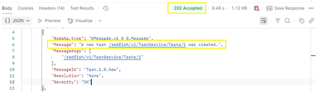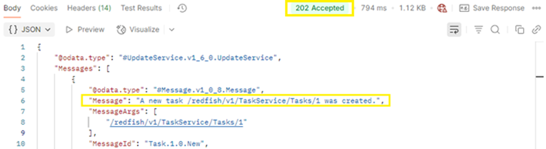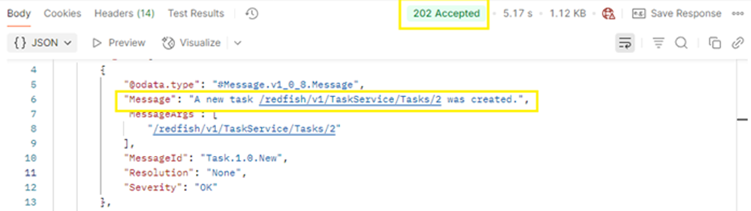 Accepted Status Code shows-up with A new task created (/redfish/v1/TaskService/Tasks/1). Please