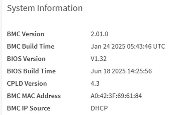 Step 6: AC off then AC on, open BMC WebGUI and check Dashboard BMC F/W, BIOS and CPLD F/W version