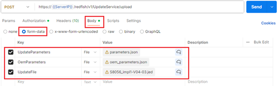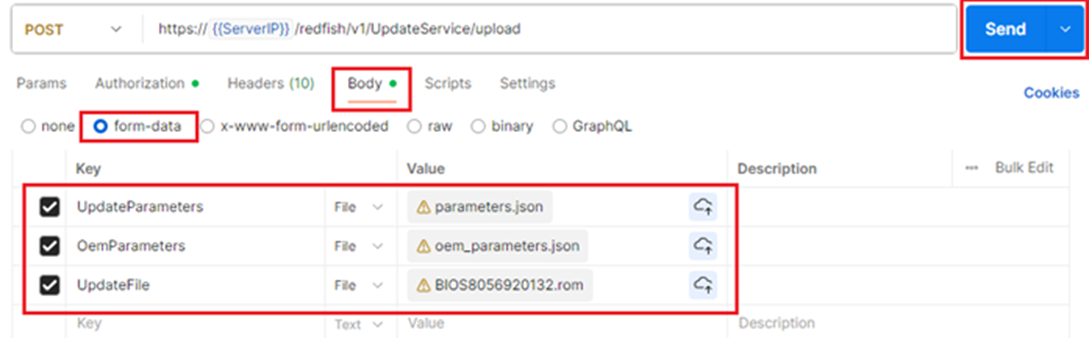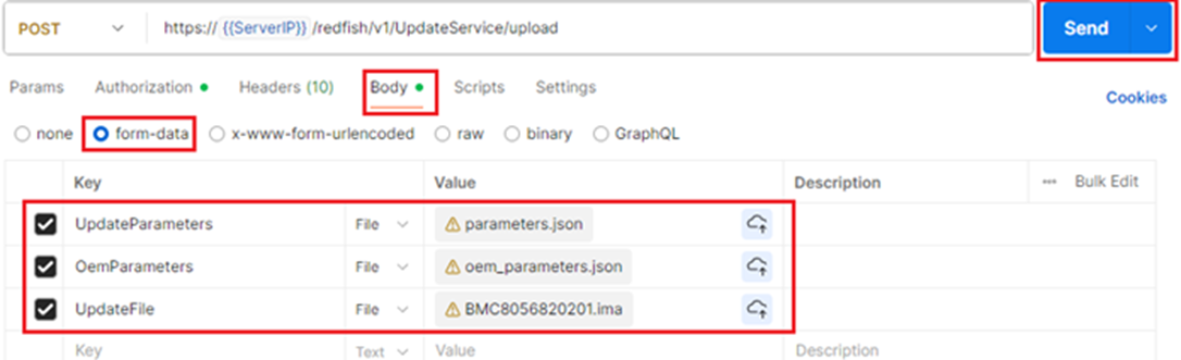 https://{{IP}}/redfish/v1/UpdateService/upload” then click Body then form-data.