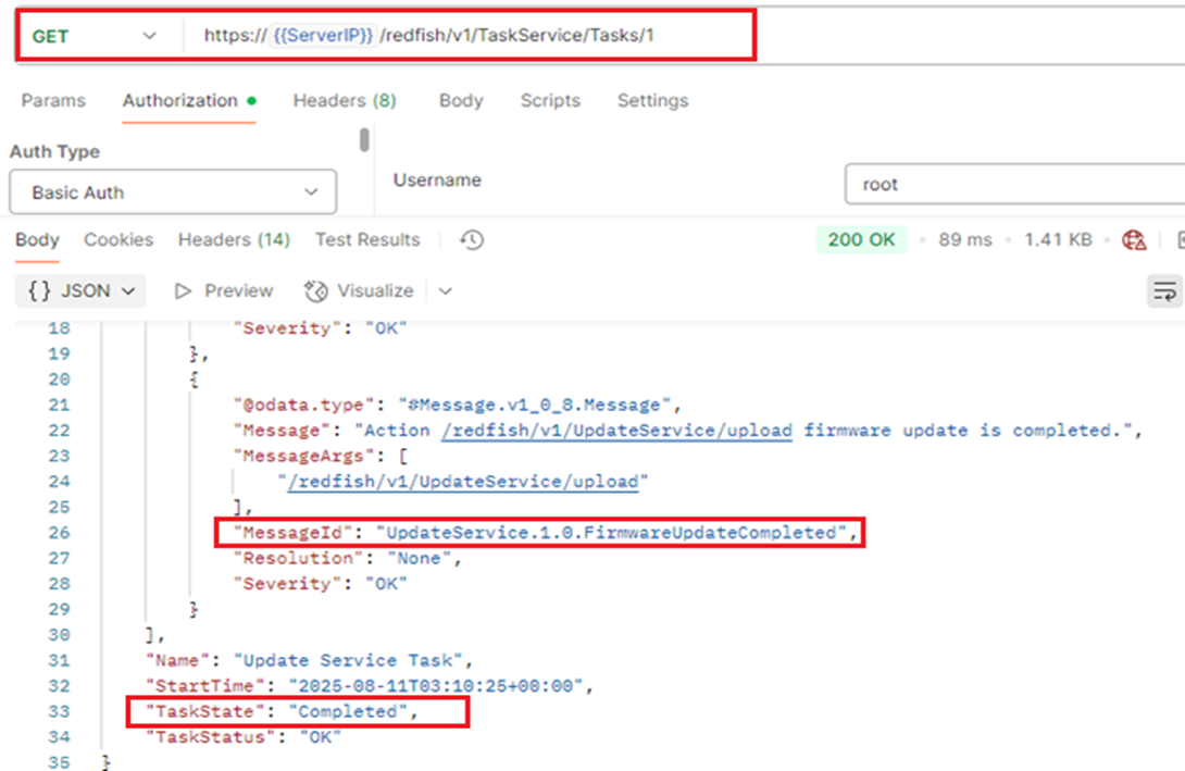 5.2 Check TaskState on "GET https://{{IP}}/redfish/v1/TaskService/Tasks/1"