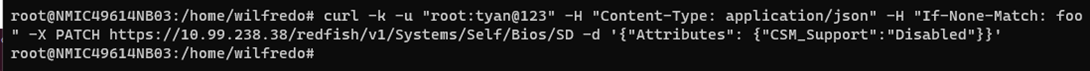 Step 2: To modify CSM Support to disabled, issue "curl -k -u "root:tyan@123" -H "Content-Type: application/json" -H "If-None-Match: foo"