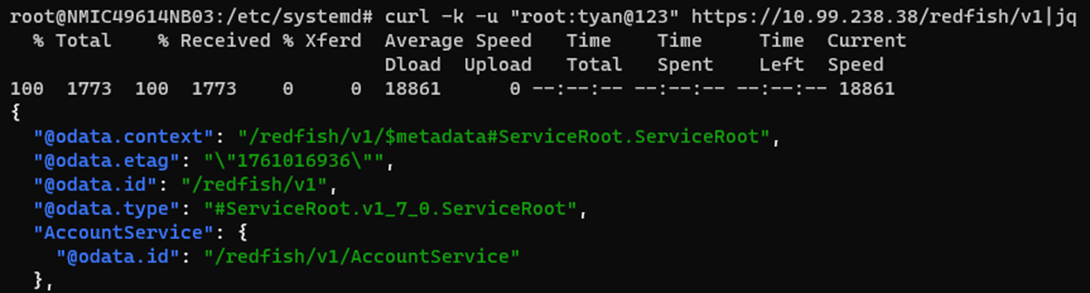 curl -k -u "root:tyan@123" https://{{IP}}/redfish/v1|jq