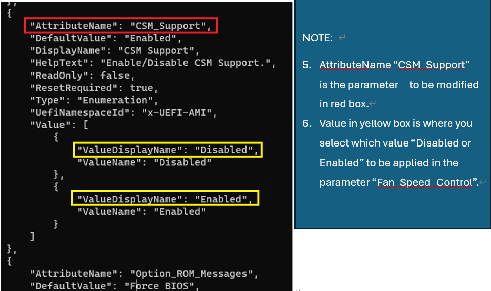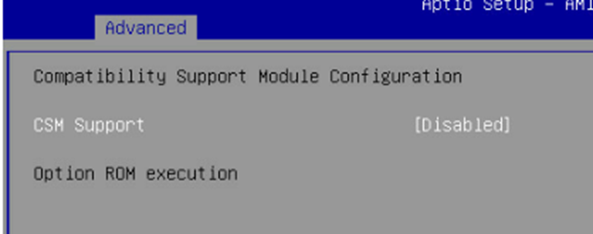 -X PATCH https://{{IP}}/redfish/v1/Systems/Self/Bios/SD -d '{ "Attributes": { "CSM_Support": "Disabled"}}'