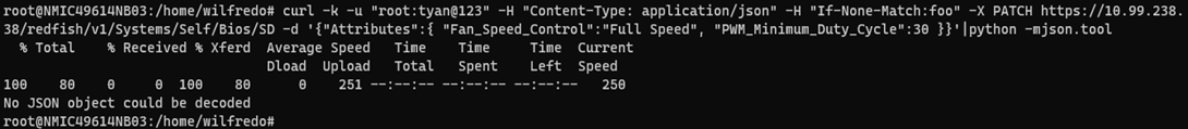 Step 2: To modify FAN Speed Control and PWM Minimum Duty Cycle, issue "curl -k -u "root:tyan@123" -H "Content-Type: application/json"