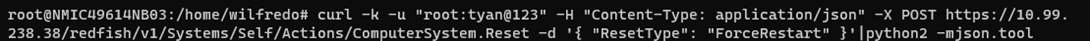 Step 3: To reboot S8056, issue "curl -k -u "root:tyan@123" -H "Content-Type: applicaion/json"