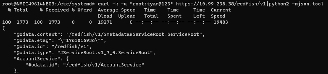 curl -k -u "root:tyan@123" https://{{IP}}/redfish/v1|python -mjson.tool