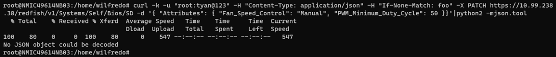 -d '{ "Attributes": { "Fan Speed Control":"Manual", "PWM_Minimum_Duty_Cycle":50 }}' | python -mjson.tool