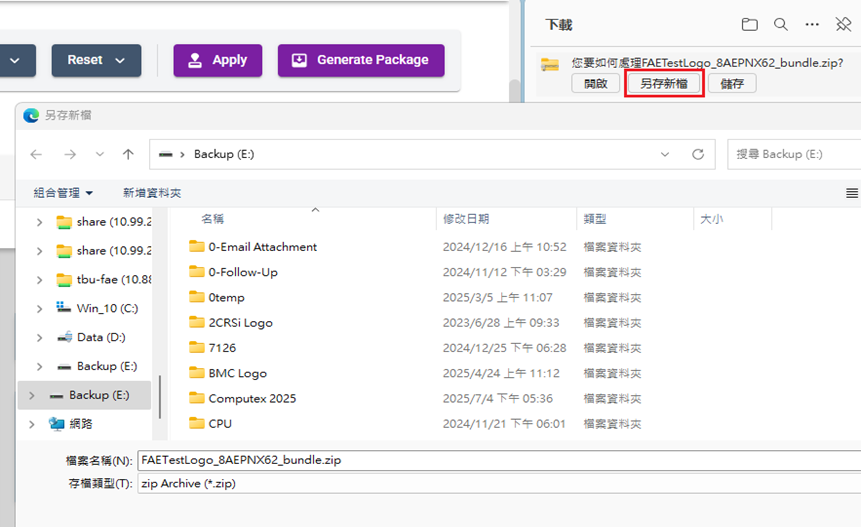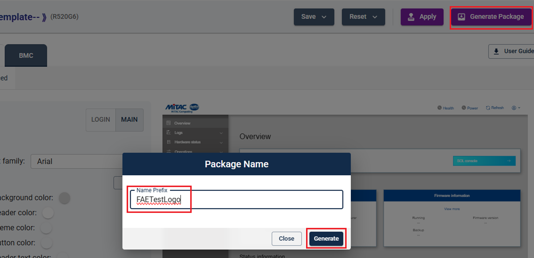 Click Generate Package button in red box, then enter Package Name then