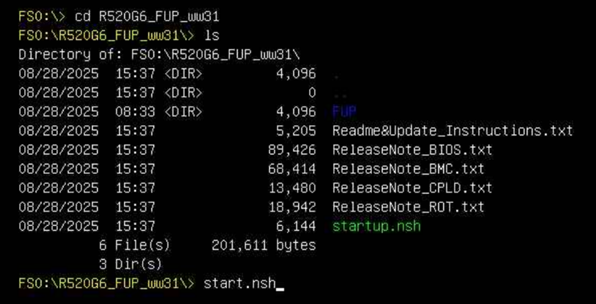 Boot into UEFI: Built-in-Shell, then cd R520G6_FUP_ww31, then issue