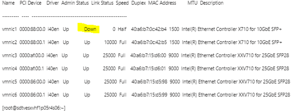 - As example above - with vmnic1port(down), by using its cable connection, connect the other end of the cable from Switch port to vmnic2 port (vmnic1 and vmnic2 are connected back-to-back). Then, check if link will establish. If link gos up, then check switch port side.
