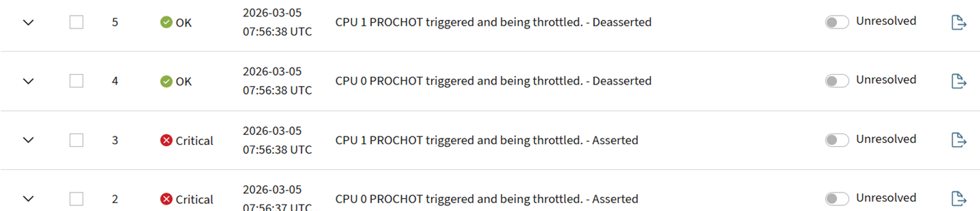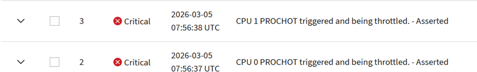 Cause: Since the PSU and CPU share the PMBUS circuit, when a PSU event is triggered, it will also simultaneously trigger a CPU event, which will then be immediately deasserted. Please confirm whether your CPU PROCHOT was triggered due to a PSU AC loss, and check if it also shows the CPU PROCHOT as deasserted. If there is no deasserted message, please contact us, and we will assist you further in investigating the issue.